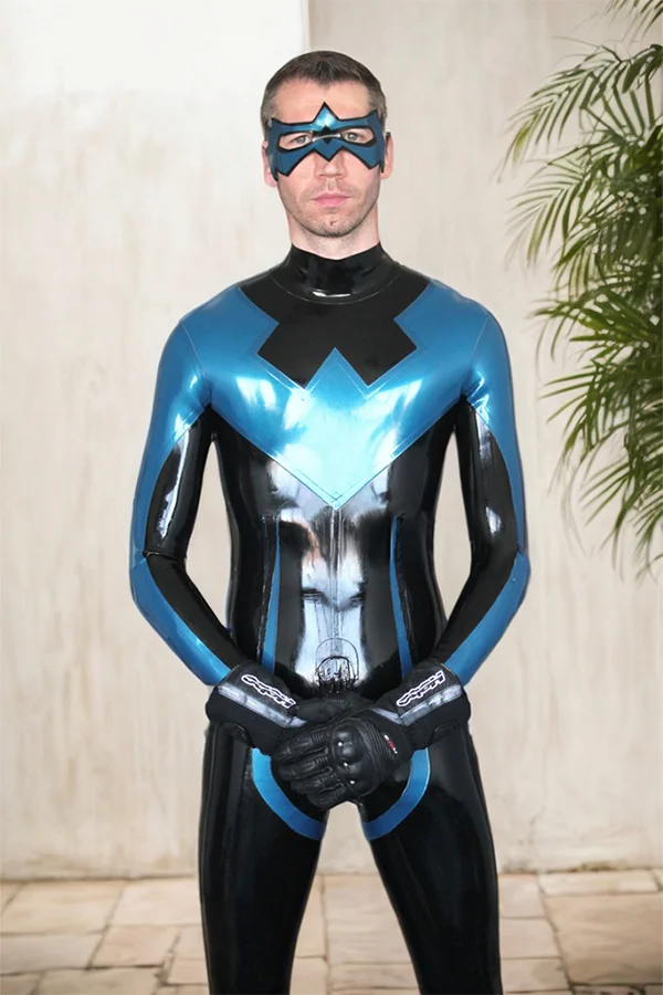 Men's catsuit designed in the style of a superhero character, available in two color options.