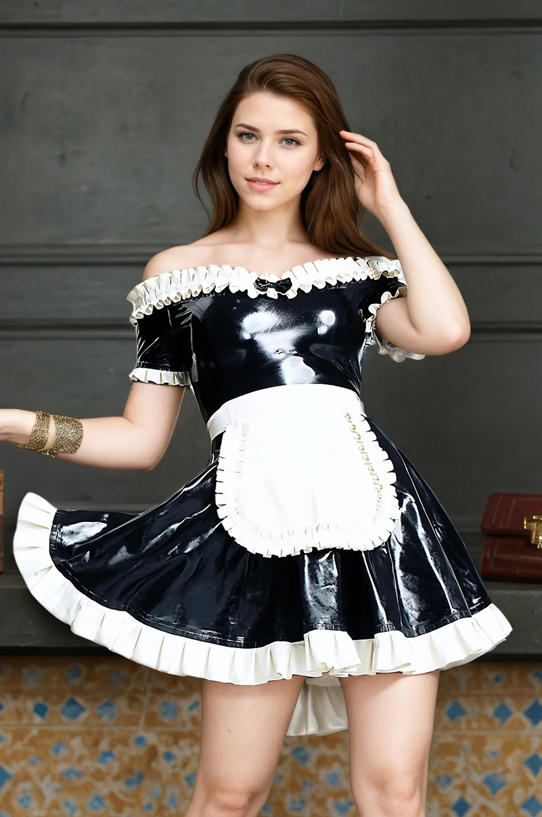 A delightful and authentic uniform-style piece, this dress is designed for those who love the classic cafe or waitress aesthetic with a shiny, modern latex twist.