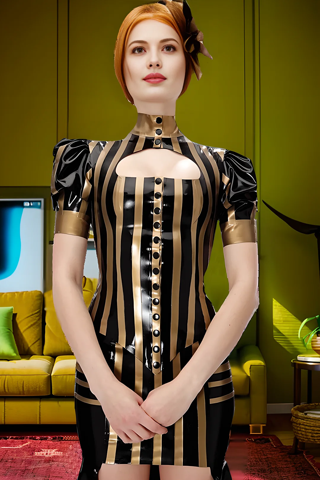 Women Latex Top Black And Gold Stripes Puff Sleeves