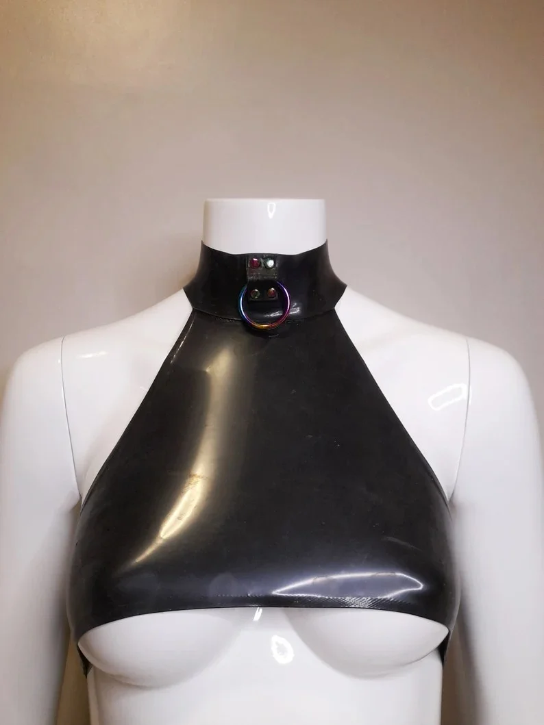 High Neck Collar with O-Ring: This top features a high neck collar with a decorative O-ring at the front.